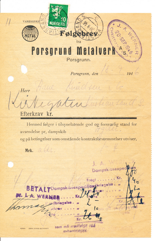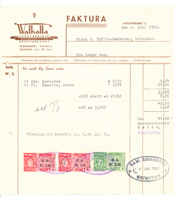 | 247 | Faktura fra Walhalla Sepefabrikk i Krs 1947 med omsetningsavgift | Bud | |||