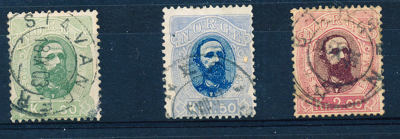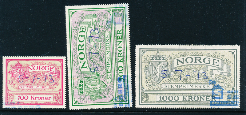 | 254 | Stempelmerker 200-500 og 1000 kr brukt og blekkannulert 5/7-73 | 100 | |||