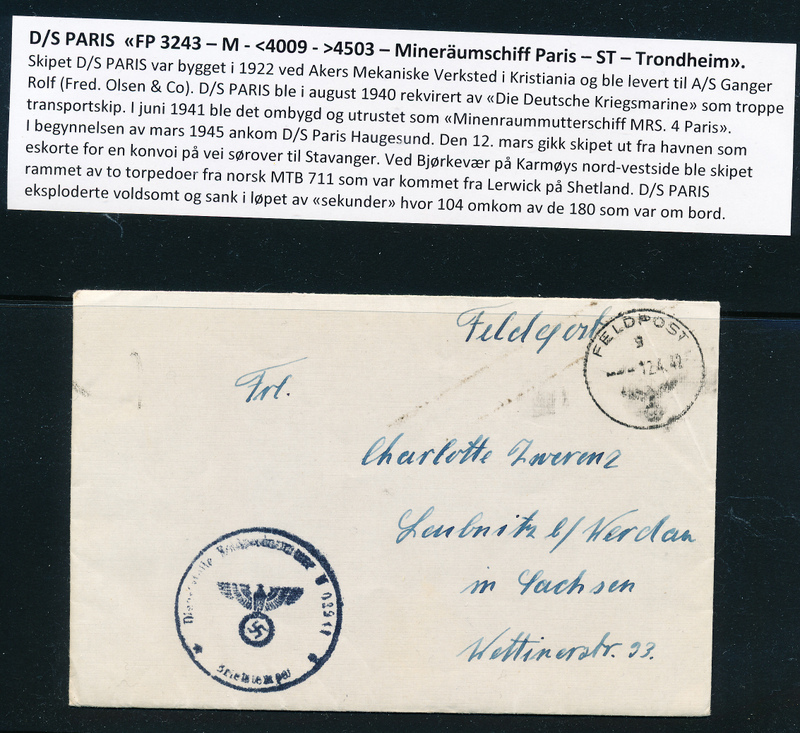 | 266 | B | Feldpost brev 12/4-42 til Sachsen sendt fra D/S Paris som var | 100 | ||
